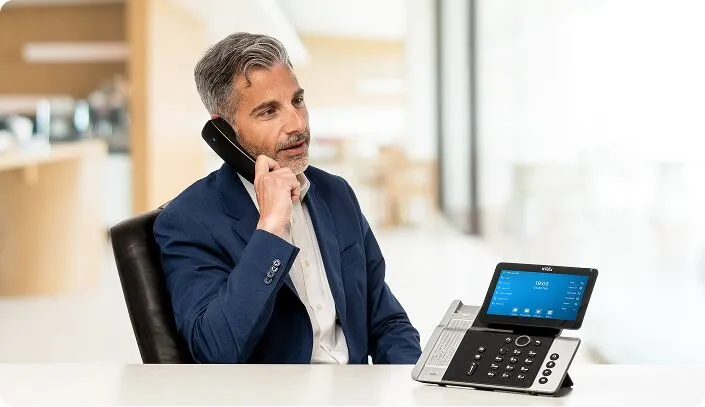 An ergonomic VoIP desk phone with WiFi, Bluetooth, and presence, designed to keep customer facing teams comfortable and productive throughout the day.